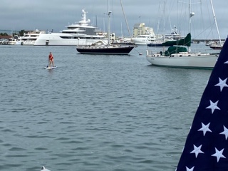 Our next stop was Newport, RI for the week. The Rover crew are still working and need good internet connectivity.  We got a mooring but then moved to the anchorage among many large power and sailboats. As much as we love Annapolis, Newport certainly is more of the boating capital!  Midtown Oyster House is a favorite dinner spot and Zelda’s boasts a good fish and chips and more. We enjoyed a visit on Rover from Annapolis friends who have a place in town.  We enjoyed another Mudslide, this time at The Black Pearl (sorry Oar I think the Pearl’s are better!). Newport offers so many outdoor activities.  From Thames Street (main street in town) at Memorial Blvd to the Cliff Walk is about 1/2mile.  You can run, walk, or bike and enjoy the ocean scenery and the mansions. I preferred Ocean drive, no sidewalks, but, exquisite homes to ogle over. Newport harbor is an awesome place to stand up paddleboard (SUP). Great views of the mega yachts in port and docked at Goat Island and Newport Shipyard.  For provisions, the Stop and Shop is a good grocery store on Bellevue Ave, less than ½ mile from Thames Street.  It is alongside the hardware store and the International Tennis Hall of Fame. The dinghy dock at Ann Street Pier offered clean heads (toilets), showers (closed due to Covid), laundry and ice.  We took advantage of the laundry and the Newport breezes made for a quick dry!  We also met up with more Annapolis friends on their boat as Newport is an “all around” great meet up location.  We had to hunker down for one night as the named Tropical Storm, Faye, was to arrive.  Thankfully, for us, she decided to go west and we did not have any issues.