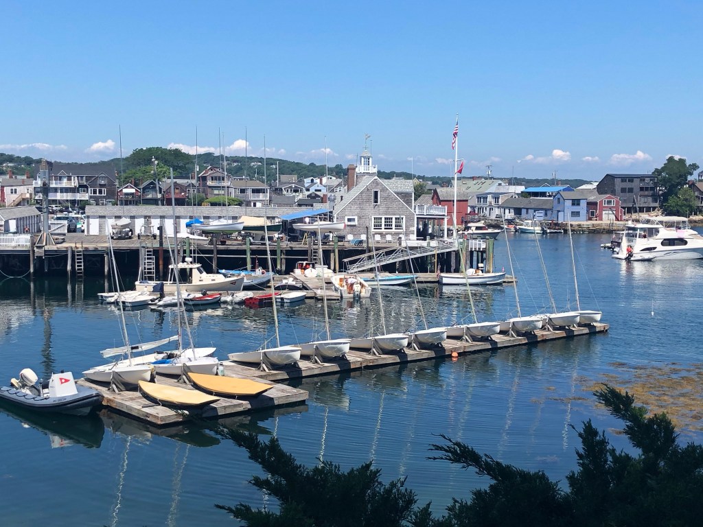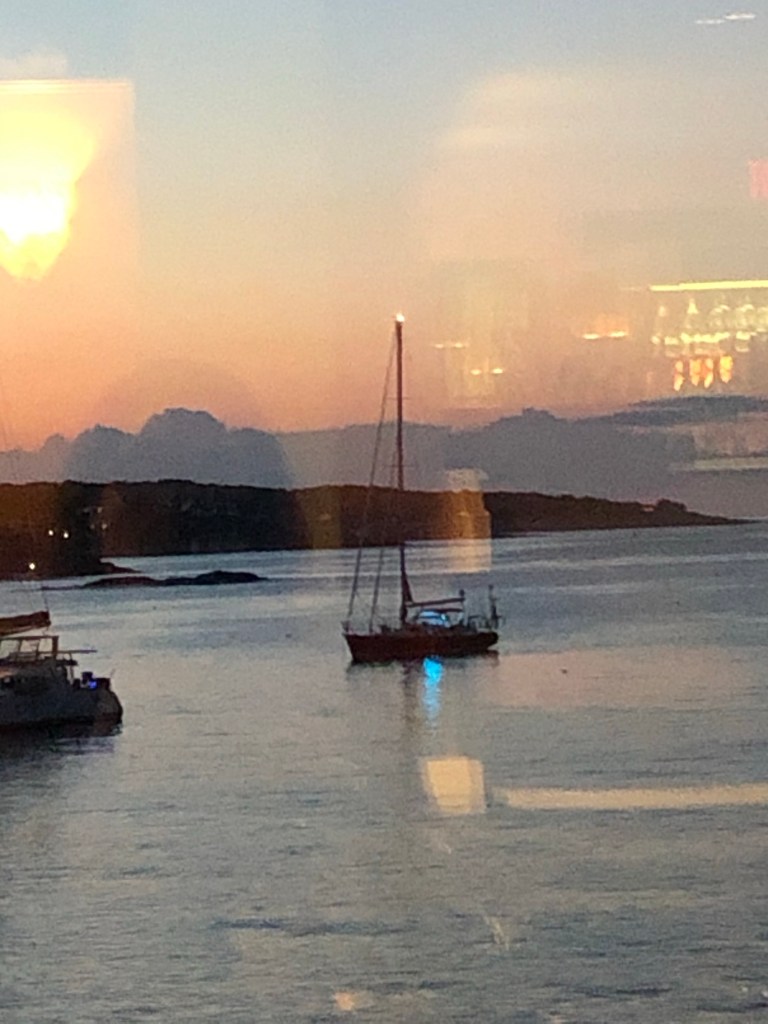 We departed Gloucester for the postcard-perfect town of Rockport, Ma. We were told to stop here from other cruisers we met in the anchorage at P town. We are happy to have met them as this was a must see. It a picturesque beauty atop rock and granite cliffs with blue green waters. We anchored off Front Beach with a short dinghy ride to town. Beware, this town sits high from the sea and because the tides are huge at 10 feet, you literally must climb a seaweed covered wooden ladder to get on land from the floating dinghy dock. There are many shops (Lula’s Pantry is a great kitchen store), cafes, restaurants, ice cream, boats and lovely Atlantic Ocean views from the rock and granite formations. We enjoyed a dinner at Bracketts Ocean View Restaurant with a terrific view of Rover in the anchorage and a stunning sunset. A yummy dessert at the Ice Cream Store completed the evening. Great runs along the water, quiet streets and Public Foot Paths are all over the place, some along the water and others in wooded areas (beware tick haven!). There is also the Latoff Farmers Market about 1 mile outside of town, an easy walk for delicious sweet corn on the cob and fresh tomatoes. Rockport is also a stop on the commuter train, the T, from Boston, so it is very accessible.