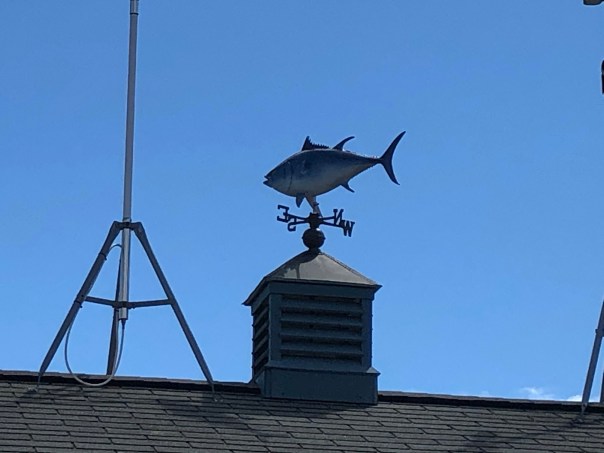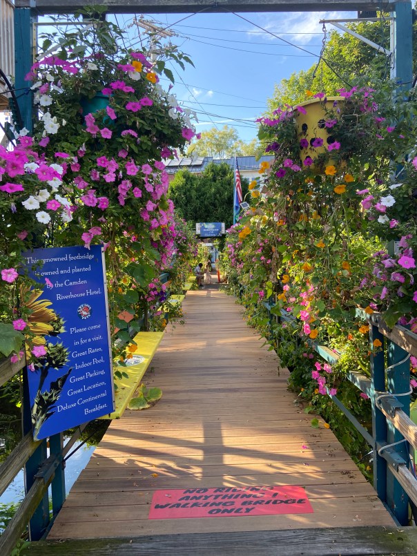 We moved Rover a short 8 miles up the coast to the gem of Maine, Camden! This is a must for anyone coming to Maine. It is equidistant from Portland and Bar Harbor, about 70 miles drive each way. We anchored and spent 4 days sightseeing, shopping, exercising, and eating! There is a lot to do in this small town. Our first day we ventured to a farmers’ market, about 1 mile from town, for lovely sweet corn, tomatoes, and of course blueberries! We enjoyed the shops and the restaurants, namely, Fresh and Co and Franny’s Bistro. These 2 restaurants had amazing food! Both farm/fish to table with interesting dishes and delicious seasonings. Both boasted lovely outdoor seating with Fresh and Co in town near the water and Franny’s a few streets inland. Franny’s was a charming house with indoor/outdoor seating and white lights strung overhead on the patio.