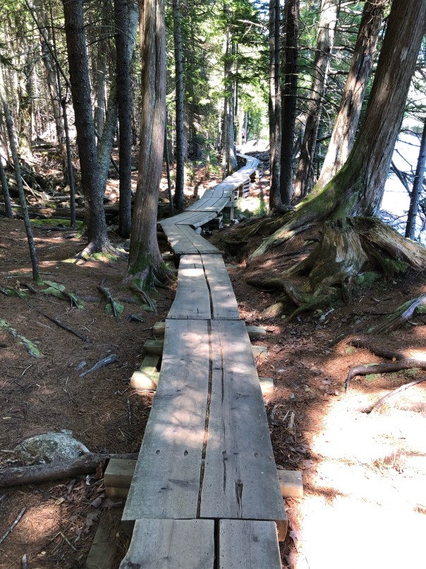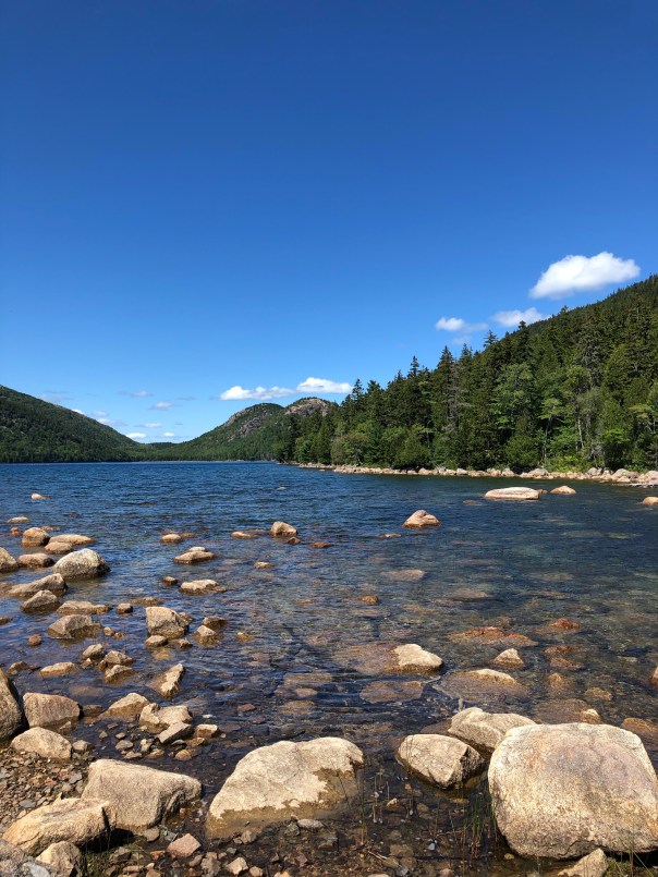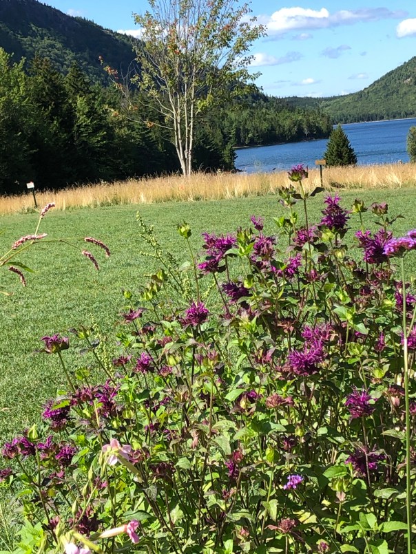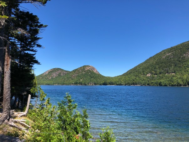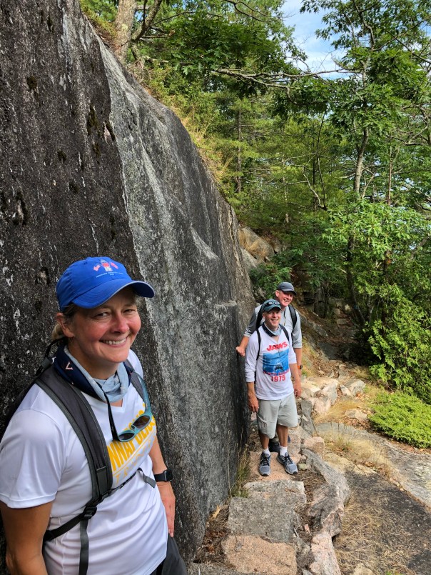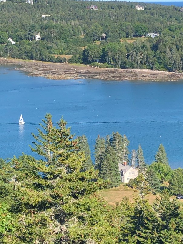 Next up was SW Harbor on Mount Desert Island. We moored here for the week as we needed to tend to some boat maintenance. Mount Desert Island, the largest island off the coast of Maine, is home to SW Harbor, NE Harbor, Seal Harbor, Bar Harbor and Acadia National Park to name a few. We enjoyed time with friends, Carolyn and Chris, from Annapolis who now live in SW Harbor. They have been a wealth of knowledge sharing many tips, restaurant and hike recommendations, and a Coast of Maine guidebook for cruisers. Lisa, Carolyn and I enjoyed an amazing yoga class in a barn with lovely breezes and green views overlooking a golf course. We hiked the Flying Mountain Trail, a moderate 1.5 mile hike that you can go to by dinghy and beach it in lovely Valley Cove. On another day we trekked from the public dinghy dock about 2.5 miles to then hike the Acadia Mountain/St Sauveur Mountain Trail Loop and Valley Cove loop, about another 5 miles and 681 feet. This was a lot of rock climbing and scrambling with sweeping views of Somes Sound. To Rich’s chagrin, a 9.8 mile total day!! The next day Brian and I ventured to Seal Harbor, about a 2 mile dinghy ride from the mooring. Seal Harbor has a yacht club and a lovely cove. It is an easy walk, about 2 miles to Jordan Pond House and Trail. The trail, 3.4 miles, is on wooden planks for part of it surrounded by beautiful scenery of the mountains and a crystal clear pond. We treated ourselves to the must have “popovers,” yummy puff pastries with strawberry jam and tea at the Jordan Pond restaurant! One note about Seal Harbor, I learned Martha Stewart has a summer home or mansion called Skylands here and a Hinckley picnic boat, Skylands II. Being a big fan, would have loved to visit. Maybe if we move to Maine, we will become best friends!