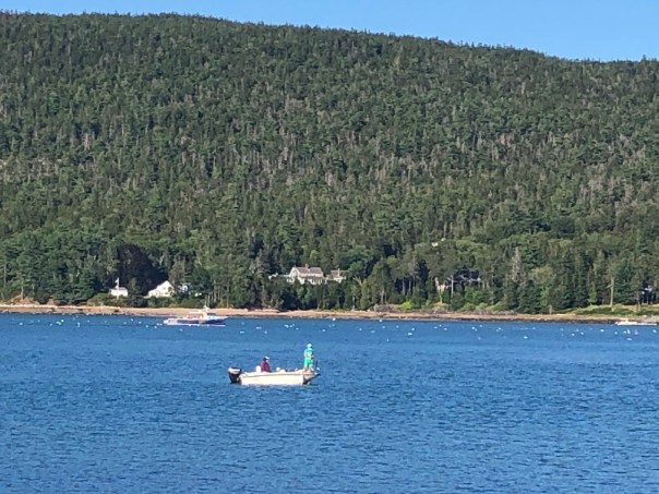 We sailed east and anchored in Pulpit Harbor on the island of North Haven. In my opinion, the best anchorage spot on the trip to date! It was large, not too many lobster or leisure boats, and the scenery was gorgeous. This was the best SUP place, many miles of small coves to explore, deep and shallow areas, lovely meadows, and beautiful homes. After a night here, we “motored” through the thoroughfare between North Haven and Vinalhaven enroute to our next stop, Stonington, a town on Deer Isle. We only spent a few hours and decided to continue on to SW Harbor. Stonington was very sleepy and not great scenery. Since we had plenty of daylight and good weather off we went on the inside of the islands to get to SW Harbor. Here is where it became very interesting as the number of lobster pots (traps) grew exponentially. We had appreciated them up until this point, but, this was unbelievable. Crab pots on the Bay pale in comparison to the number of lobster pots here in Maine. It is amazing there are any lobsters left! The challenge is not only the number of them, it is the location of them. They are everywhere, narrow channels, mooring fields, anchorages, shallow/deep water. How the lobsterman keep track of them is unknown. You need to be very vigilant when sailing or motoring on the inside of these islands with a watch system and no boating in dark. We slalomed around the pots with consideration to the rocky coast of Maine and the fog, oh yeah, that too! This made for an interesting and tiresome 18 mile journey.