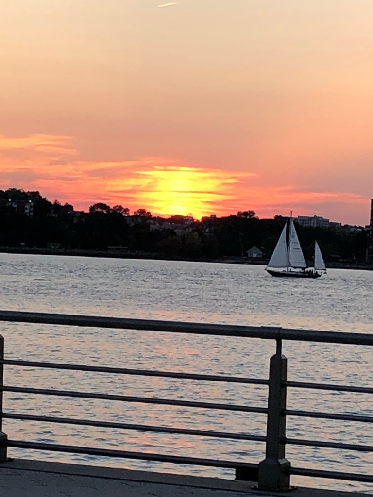 With the usual sporty entry through Hell’s Gate down the East River into Manhattan, we settled into our final slip of the trip at MarineMax Chelsea Piers. Located near the Meatpacking district of the West Village, it is one of our favorite areas. Brian lived here in his 20’s when there were lots of industrial meatpacking facilities and just a few funky bars and restaurants. Today, it is very hip, very chic and a great spot for shopping and food but without the “tourist” crowd. The Hudson River Greenway runs north and south along the west side of Manhattan along the Hudson River. If you like to run, bike, roller blade (who knew this was still in?) or walk, this is the place. I was determined to cross the Brooklyn Bridge. From Chelsea Pier south along the Greenway, across the Brooklyn Bridge and back was 10 miles, whew, but worth it! The next run was north to Central Park, through the park for about 7.5 miles, with a 5 mile walk back to the boat. In addition to the runs, Brian and I put in many walking miles to the 911 memorial, Central Park, all around the West Village, Tribeca, Hell’s Kitchen, Battery Park, Bryant Park, and the High Line Park (a must!). My Garmin was in overdrive. I do not think I will need to drive a car again since we can clearly just walk long distances. Lucky for us the weather was ideal with blue skies, sun, and cool temps all week. Chelsea Pier was a great location. We enjoyed sunsets, skylines, and watching golfers at the city driving range. There was no SUP here as the water was too wavy and too much boat and ferry traffic. Tiki (my paddleboard’s name) enjoyed the views from the boat!