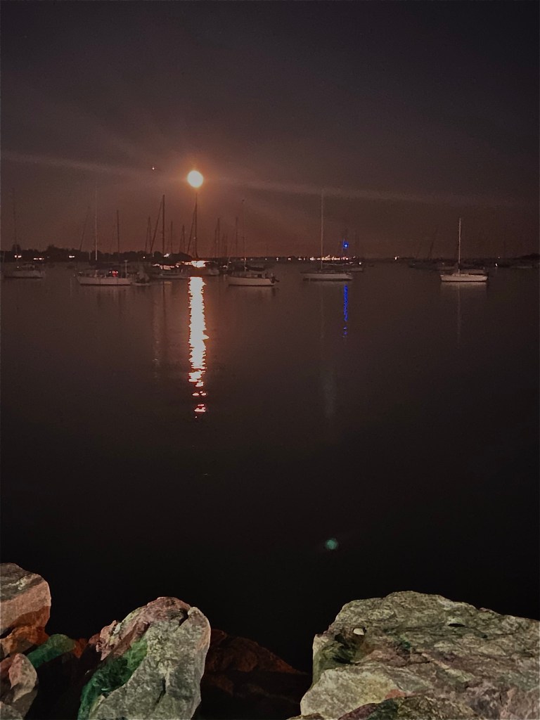 We stayed at the Mystic Shipyard West Marina. This was our last laundry, thank goodness, and onshore shower for the trip. Mystic is very charming. Lots of the same tourist shops with the added bonus of an Army Navy Store and a Nautical Marine Consignment store. Some very good finds in these places. We had to buy sailor knot bracelets for the team at Knotworks. Do you remember these when you were a teenager? As far as food and drink, we loved Sift, coffee and bakery with the most amazing scones and muffins. Sift is about a 1 mile walk from the marina and the rest of the downtown is about 1.3 miles from the marina. You can SUP or dinghy into town as well. You must have Mystic pizza, another tour down memory lane remembering the movie “Mystic Pizza,” with Julia Roberts. We had a wonderful dinner at S&P Oyster Restaurant and Bar located right at the drawbridge downtown. There is great running along the Mystic River with lovely views of the seaport. Another treat was a protein bowl from Karma Kitchen Mystic and Juicery afterwards. A quick walk near the marina is the Mystic Market West with gourmet sandwiches, salads and other yummy finds including homemade Kale chips! After Mystic we anchored in Noank, Connecticut for a night and visited our last lobster pound of the trip! Abbott’s Lobster in the Rough provided the delicious lobster and the rest was BYOB picnic style. We enjoyed the awesome crustacean with a spectacular Harvest Moon for our backdrop.