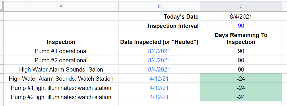 Because the Hylas bilge remains so dry, we recommend that all of these pumps and warning indicators be tested regularly. We have a large maintenance spreadsheet for Rover, and here is a screenshot of our checklist items, which we would urge any passage makers with similar vessels to adopt on a regular cadence. The formulas in these spreadsheet cells automatically calculate the number of days between the current date and the last inspected date. Note that when the interval is exceeded, we have conditional formatting in the spreadsheet cells to visually alert the user for the need for an updated inspection.