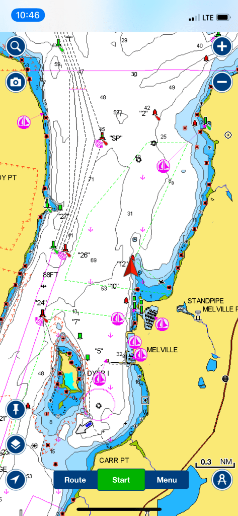 Now were mobile, so we called NEB and they said there was no way they could haul us Friday but that they may be able to get us Saturday. We were once again instructed not to leave Newport until they had a prospective haul out time. Right around this time our friends Angela and Steve also warned us that in severe tropical weather all boats in Newport harbor could be forced to leave. Where to? We had no idea – they just could not stay in the harbor. At this stage, the very real prospect that we might have nowhere to go with a hurricane bearing down on us began to form in my head. We decided to be bold: with no guarantee that they would haul us on Saturday, we would still motor up to NEB and simply anchor outside Bend Boat Basin overnight, in the hopes that they would allow us in on Saturday.