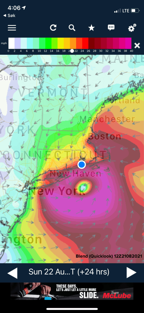 Sometimes things happen living on a boat that you just couldn’t make up if this blog were pure fiction. Last week, after a month’s wait, it was looking like our repaired diesel injection pump would be fixed near the end of the week. Just as it looked like we might get paroled from Break Down Prison, though, Tropical Storm Henri formed offshore in the Atlantic. Most early models predicted that Henri would take an easterly turn and would not affect the New England coast. Around mid week I got a warning from my friend Glenn that his weather service predicted that many models had under estimated the chances of a New England landfall and that Henri posed a “material threat” to us. We began to consider options for preparation, but there was no certainty the engine would even be fixed before the prospective weekend landfall, so there was no certainty that we had any options to prepare other than removing the sails and canvas. By Thursday the forecasts made a New England landfall look much more likely, so we began calling marinas. We learned that haul outs were first-come-first-serve, and that the only marina that might be able to take us was New England Boat Works (NEB), which was 6 miles north in what used to be called Bend Boat Basin. Ironically, Bend Boat Basin is where my family’s brand new Pearson 40 was delivered to Mathews & Fales, our Pearson dealer, in 1979. On Thursday, NEB said not to leave Newport until they were ready to haul us because there were too many boats converging on the Basin, which meant they had to hold them outside of the basin in the Bay and lead them in one at a time for haul out.