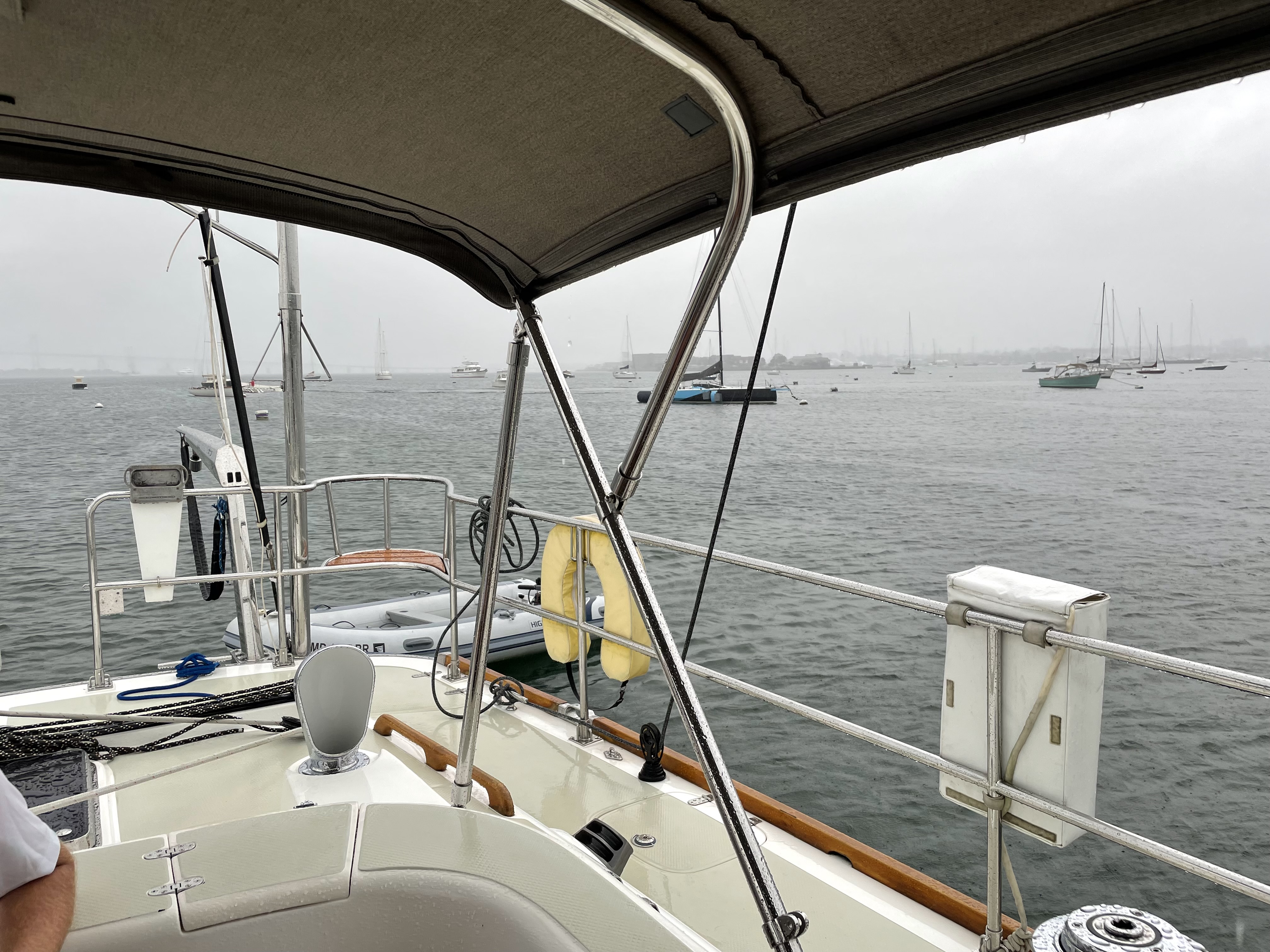 Sometimes things happen living on a boat that you just couldn’t make up if this blog were pure fiction. Last week, after a month’s wait, it was looking like our repaired diesel injection pump would be fixed near the end of the week. Just as it looked like we might get paroled from Break Down Prison, though, Tropical Storm Henri formed offshore in the Atlantic. Most early models predicted that Henri would take an easterly turn and would not affect the New England coast. Around mid week I got a warning from my friend Glenn that his weather service predicted that many models had under estimated the chances of a New England landfall and that Henri posed a “material threat” to us. We began to consider options for preparation, but there was no certainty the engine would even be fixed before the prospective weekend landfall, so there was no certainty that we had any options to prepare other than removing the sails and canvas. By Thursday the forecasts made a New England landfall look much more likely, so we began calling marinas. We learned that haul outs were first-come-first-serve, and that the only marina that might be able to take us was New England Boat Works (NEB), which was 6 miles north in what used to be called Bend Boat Basin. Ironically, Bend Boat Basin is where my family’s brand new Pearson 40 was delivered to Mathews & Fales, our Pearson dealer, in 1979. On Thursday, NEB said not to leave Newport until they were ready to haul us because there were too many boats converging on the Basin, which meant they had to hold them outside of the basin in the Bay and lead them in one at a time for haul out.