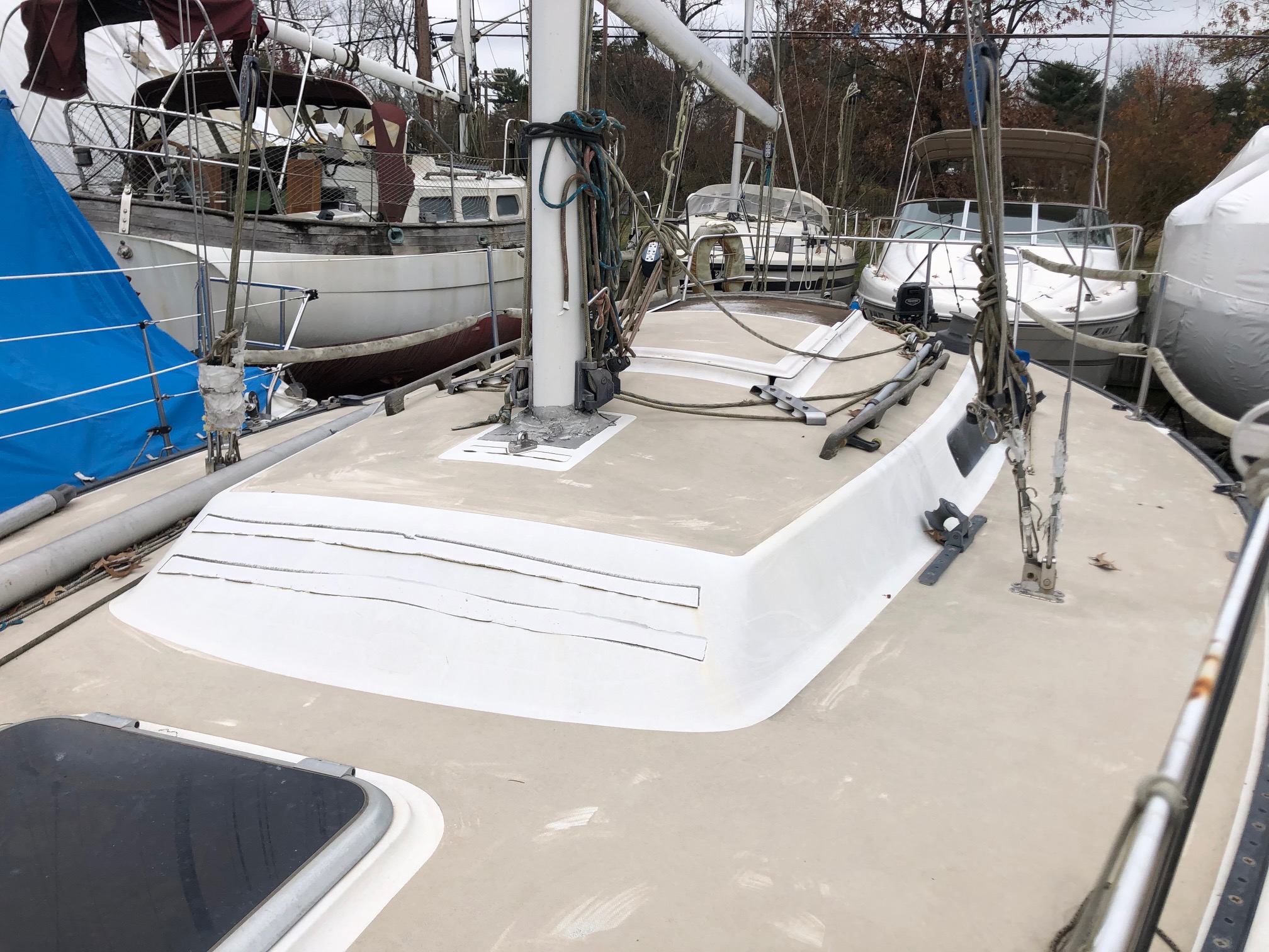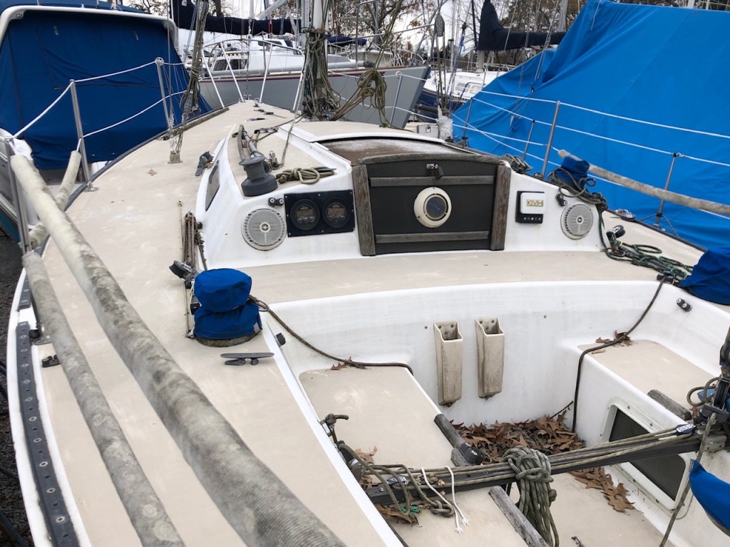 I found out because over the years I have kept in touch with the guy who owned her before the last owner. As it happens I had travelled to see her a couple of times in recent years and I knew she had fallen into neglect. When I saw her in 2018 right after we sold Le Saberage she was in the water and had obviously not been sailed in many months or even years. I asked Peter to put me in touch with her owner to see if I could help fix her up and get her sold. The owner, who was reputed to be in poor health, never responded to Peter.