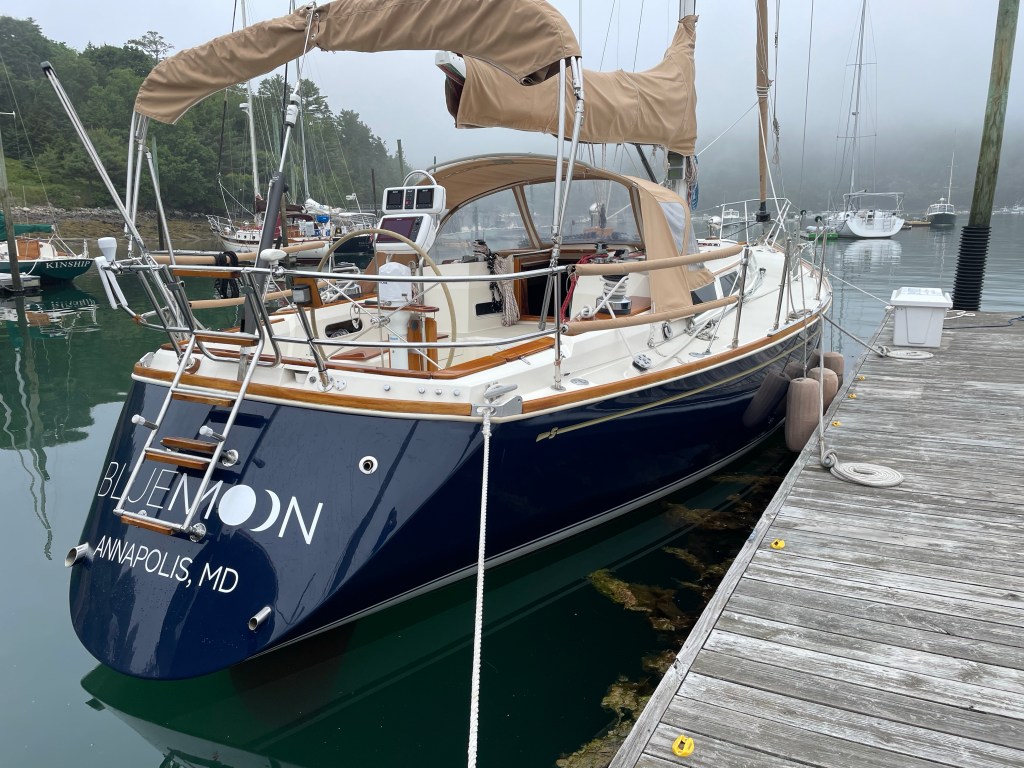 I arrived last evening with a rental car full of galley equipment, provisions, tools and clothes and I’m dodging rain showers getting it all aboard here in Northwest Harbor Maine!