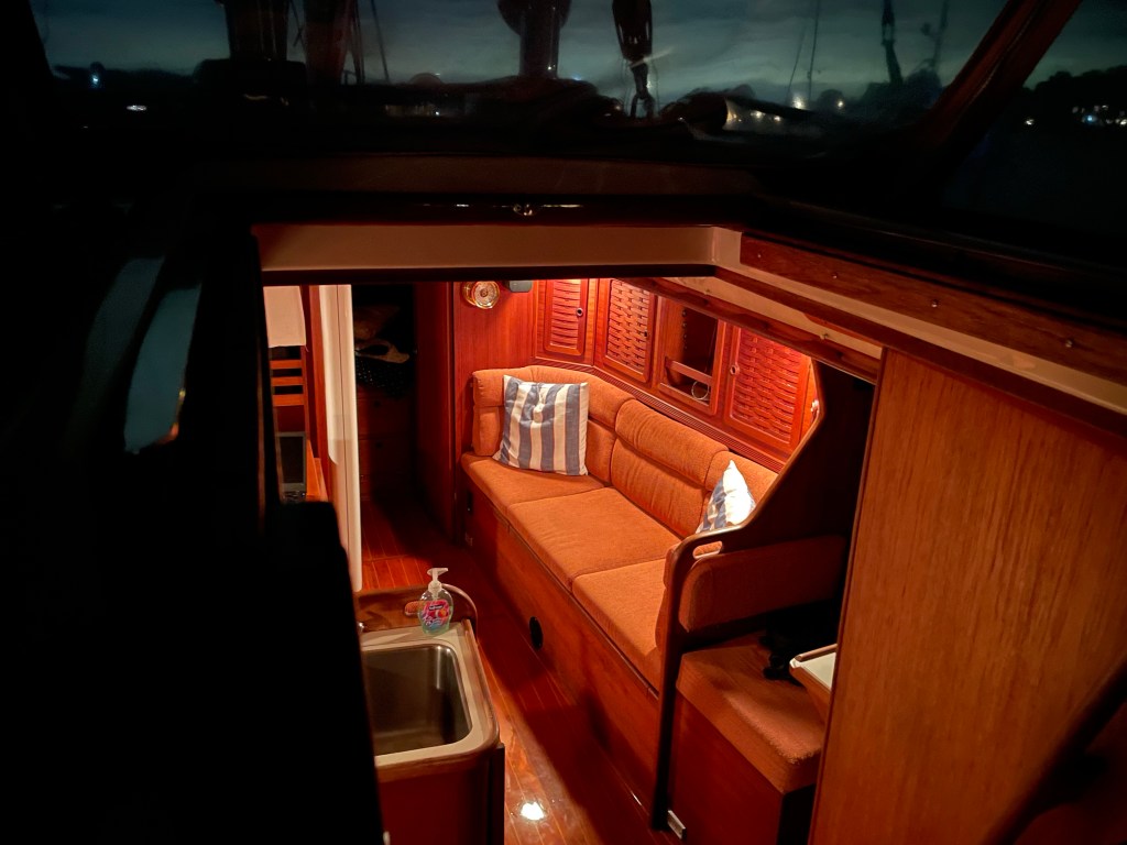 On cold nights in Fort Lauderdale we ran the reverse-cycle AC / heat on shore power aboard our Sabre 42. Yes, it is effective, but heat pumps create damp, noisy and somehow COLD “heat.” Just think about heat pumps in a house – how does “heat” manage to feel so drafty and cold?!?! Aboard our Sabre 42, when we ran the reverse cycle heat in Fort Lauderdale we had crazy amounts of condensation forming all throughout the boat – literally dripping from the metal frames of our deck hatches while the compressor and raw water pump noisily came on and offline. Not so the diesel heat on Blue Moon. It is bone dry and cozy, producing only a distant and mild whooshing noise. I am looking forward to a long, cold Annapolis fall before I haul out – cruising locally or just enjoying the boat in town, venturing on deck for a wee dram of scotch in cold fall breezes before retiring down below to warm up in our toasty down-east teak cabin while taking in my favorite 80s television on Amazon Prime like I did tonight.