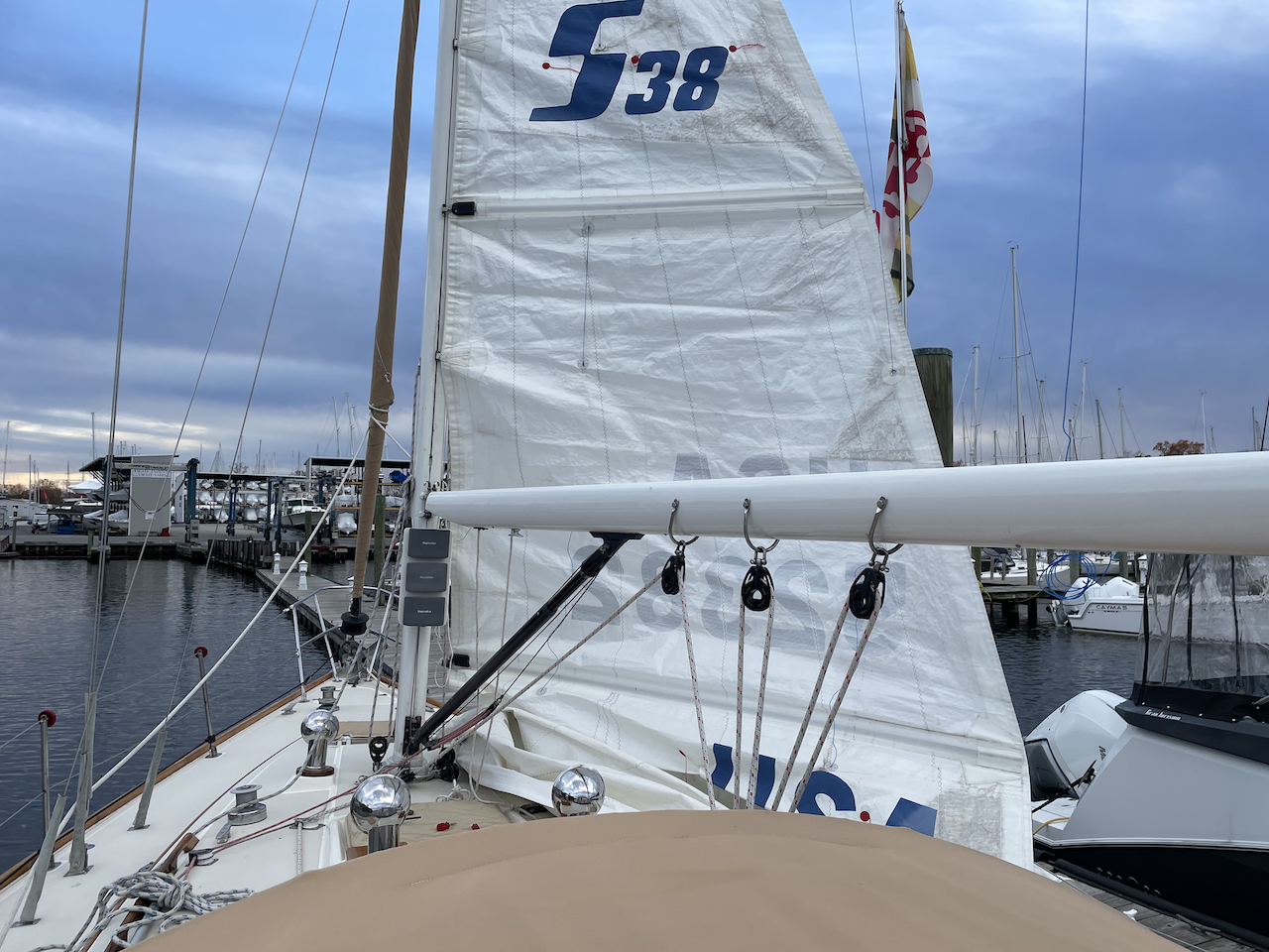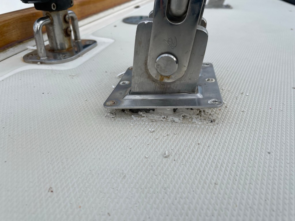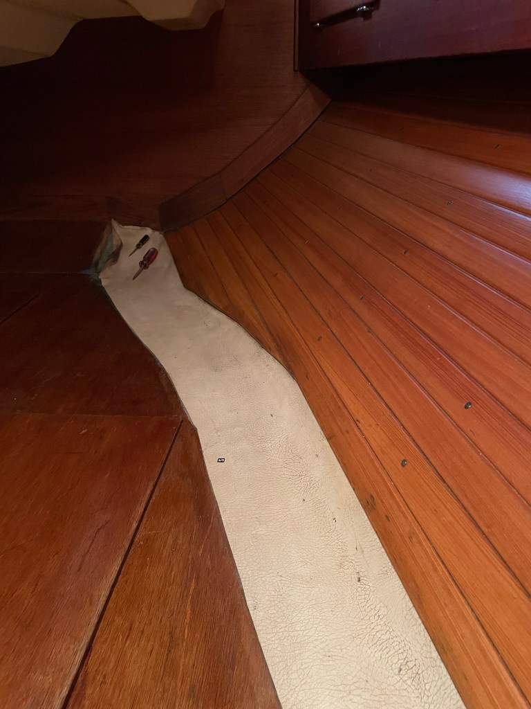 Experience has shown me that at this stage in my winter projects I have to be careful not to open too many workstreams without making significant progress on any of them. This risk is particularly large when it comes to demolition, which is usually easier and more fun than putting things back together! Yesterday I re bed the mount for our outboard motor crane, which I suspect may be the source of our aft cabin leak, and I also re bed the chainplate I tried (and failed) to re seal last weekend. As it turns out, I don’t have enough working room to re bed it properly with butyl tape, so I have reverted to 3M 4000 caulk. The next time I have the rig out I will re-bed all of them with butyl tape but I don’t have enough access to do it right with the rig in. Today I started tearing out the wood panel behind the port settee so I can begin ripping out the vinyl backing behind it. A driving rain has already begun to fall that is expected to last through tomorrow. Have I succeeded in fixing both the aft cabin and port chainplate leak? Watch this space to find out!