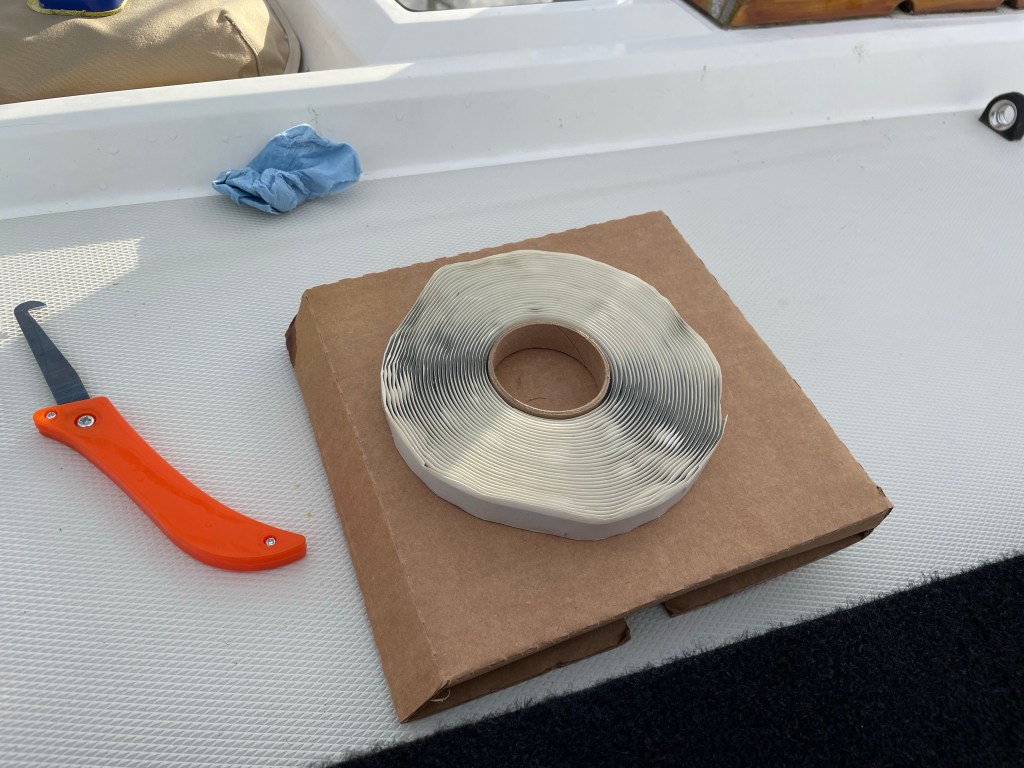 Butyl tape comes in rolls and lives literally forever. It never dries out or cures, retaining the consistency of clay or wet bubble gum essentially indefinitely. It’s the world’s best sealer for hardware on boats!