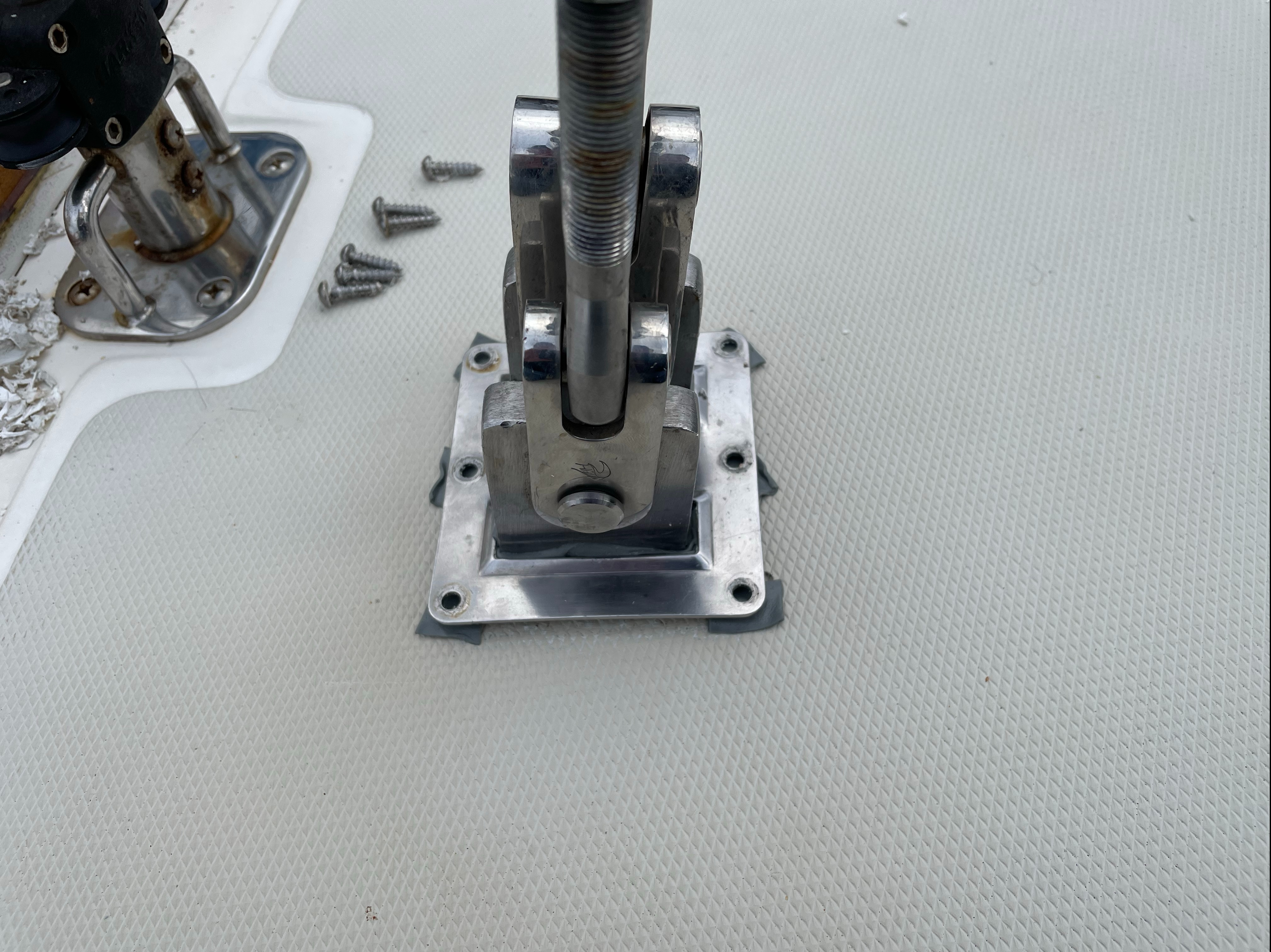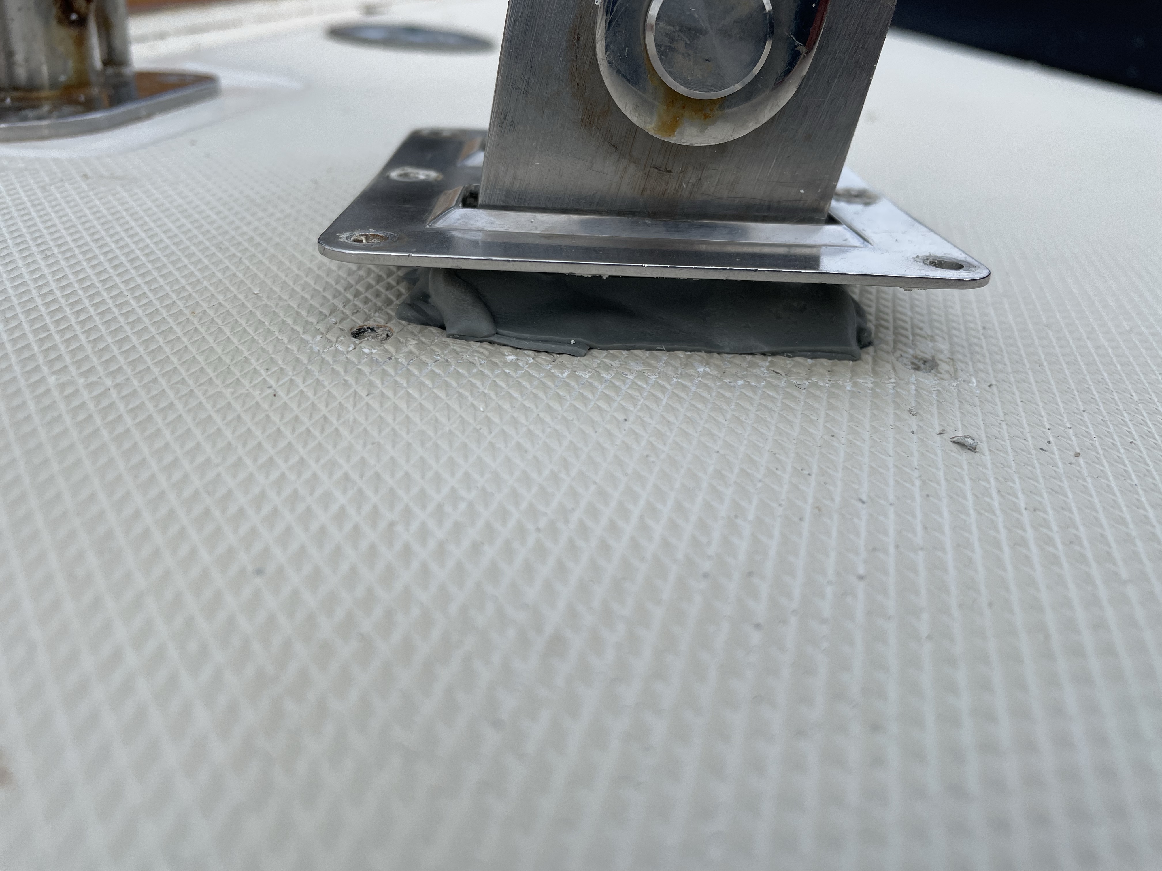 Early on when owning a recently-purchased brokerage boat, it’s always a little game of “catch up” hunting down the deck leaks one inherits. During our summer season in New England I fixed a few but I have a few more to go, primarily as a result of Hinckley Yacht Services either having chosen poor sealants, having done a poor job of preparing mating surfaces, or both when sealing items.