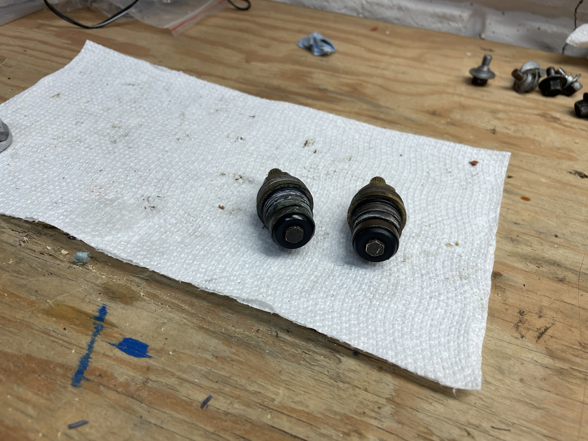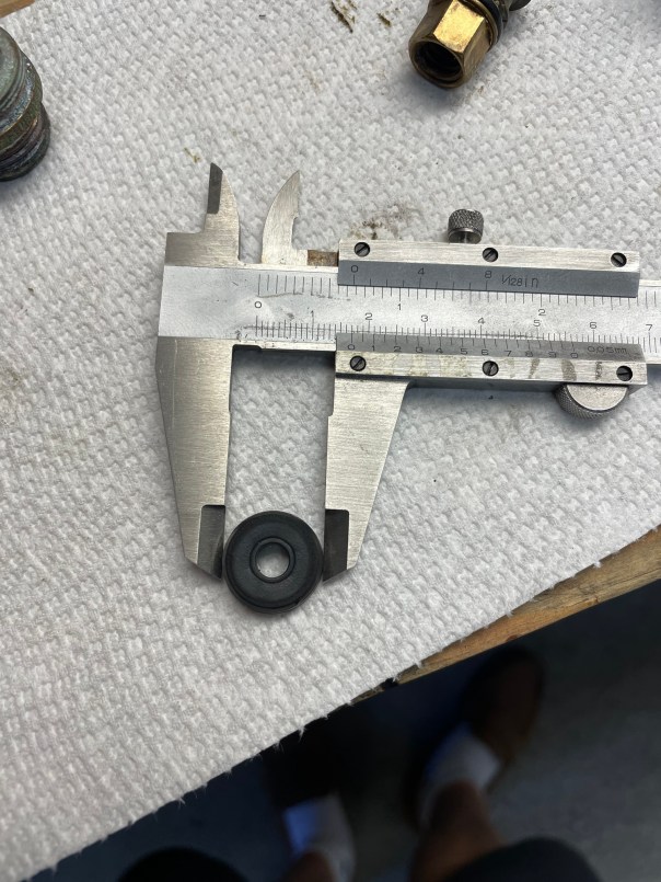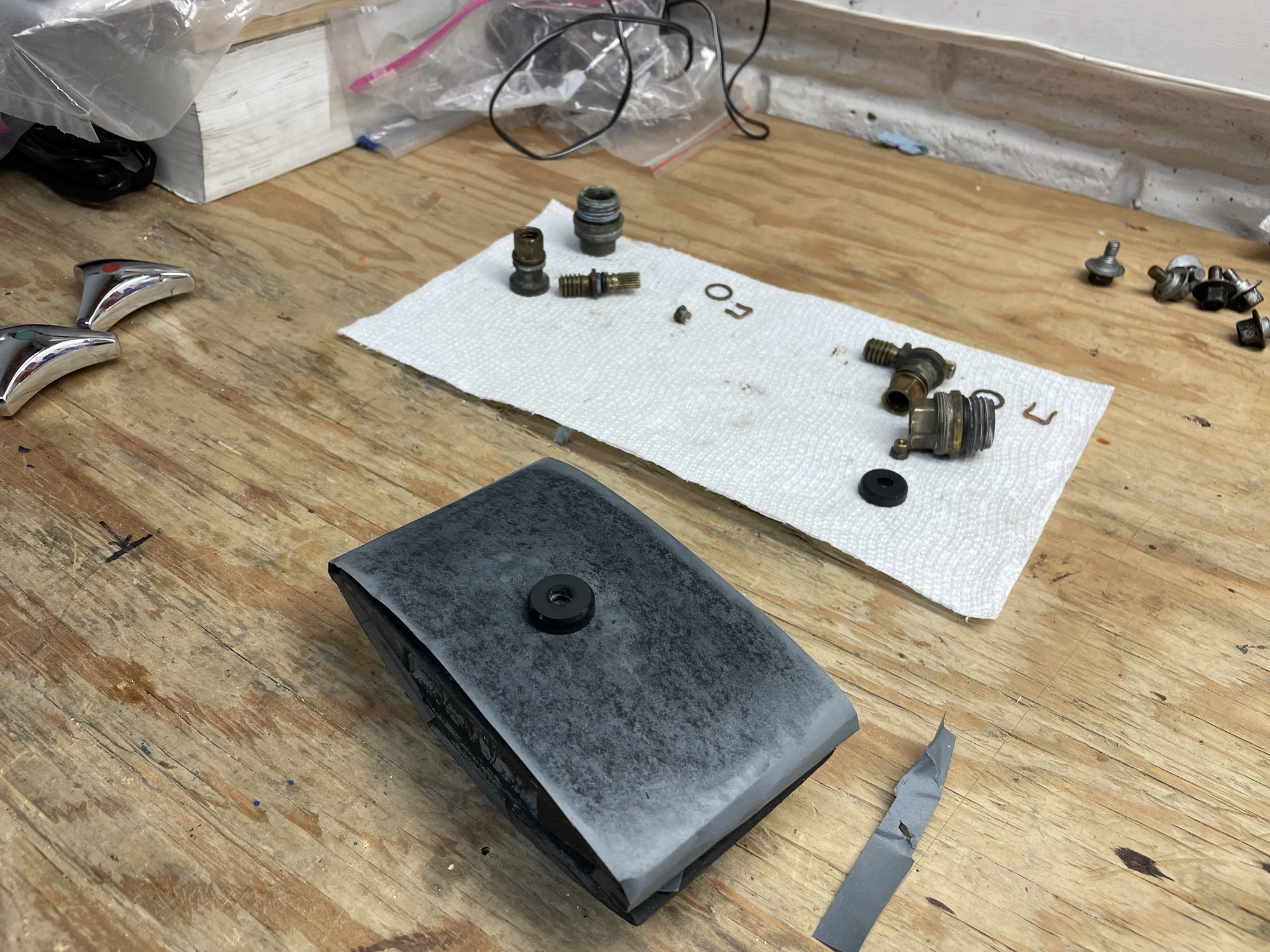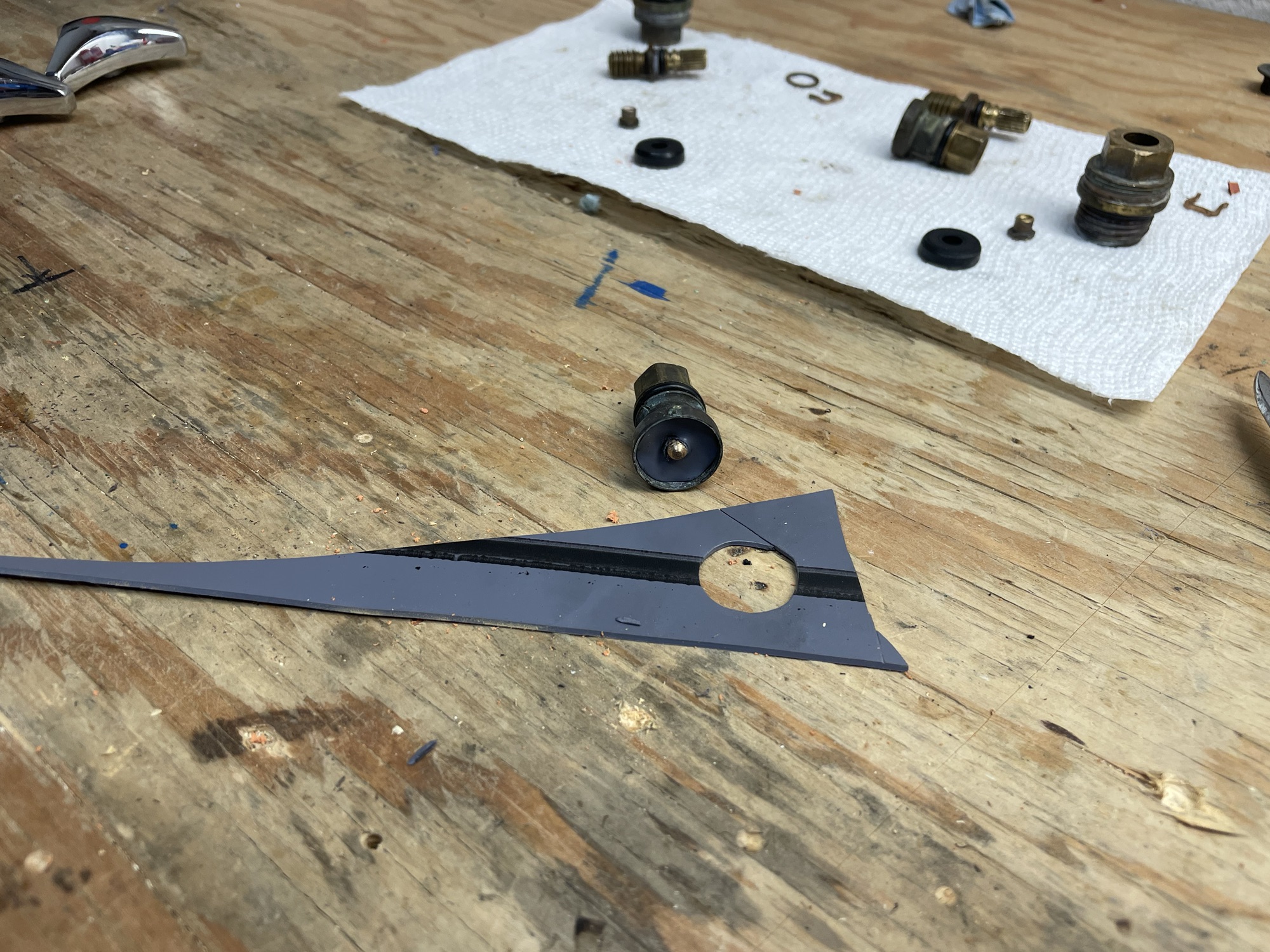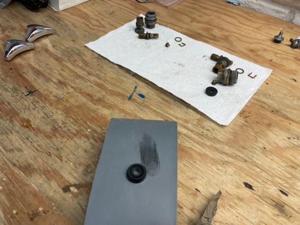 Out with the old!For these two sinks, contemporary replacements can be found with the identical hole pattern and water line attachment.Much better! Easy, and not expensive. The galley sink was a much bigger problem. Long story short, there is no way to replace the faucet on this boat without cutting a hole in the back of the settee forward of the sink. I weighed the options, then decided to make a run at dis-assembling it to see if there were any user-replaceable parts. With the faucet apart, I learned that the reason the faucet dripped no matter how hard we screwed down the taps was that the rubber gaskets designed to stop the water flow had dried out and become compressed to a fraction of their original width.I measured their dimensions and a bit of web searching showed me that finding direct replacements would be impossible. I would either need to replace the entire faucet, or find way to modify the existing gaskets. Modification of the existing gaskets was the shorter path by far, so why not try? I used some wet dry sand paper to sand through the dried out portions of the gasket to reach the supple, moist rubber underneath. Next I fished out some rubber gasket material I had lying around the shop, and cut out shims to increase the thickness of the original gaskets. Hmmmm… it looked promising! I cleaned and lubricated the original internal helix mechanism and re assembled the components.