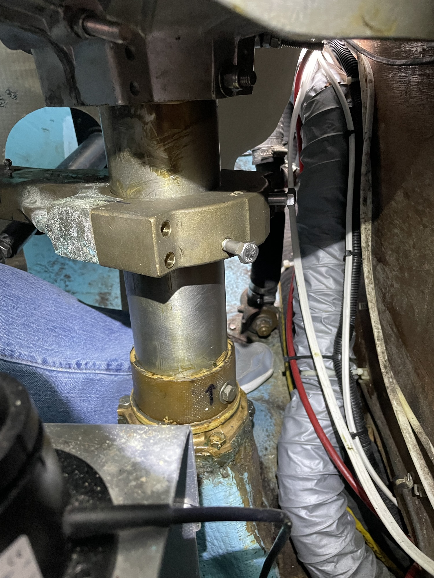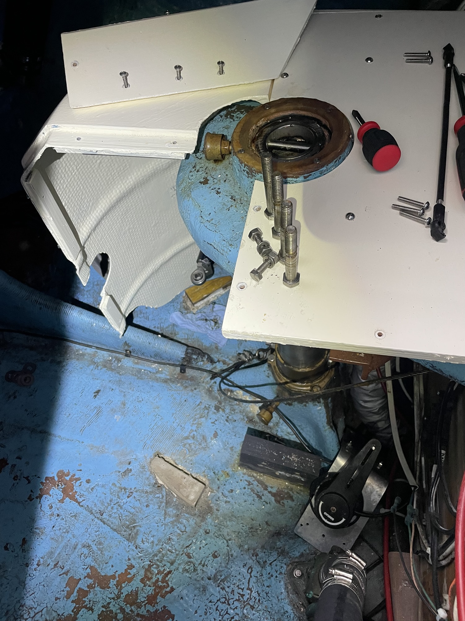 We have been noticing a recurrence of water getting into the rudder, so we decided to drop it down so Diversified can grind out the area around the rudder post for a re seal. That meant I had to get the steering quadrant and auto pilot arm off before lowering the rudder onto a block.