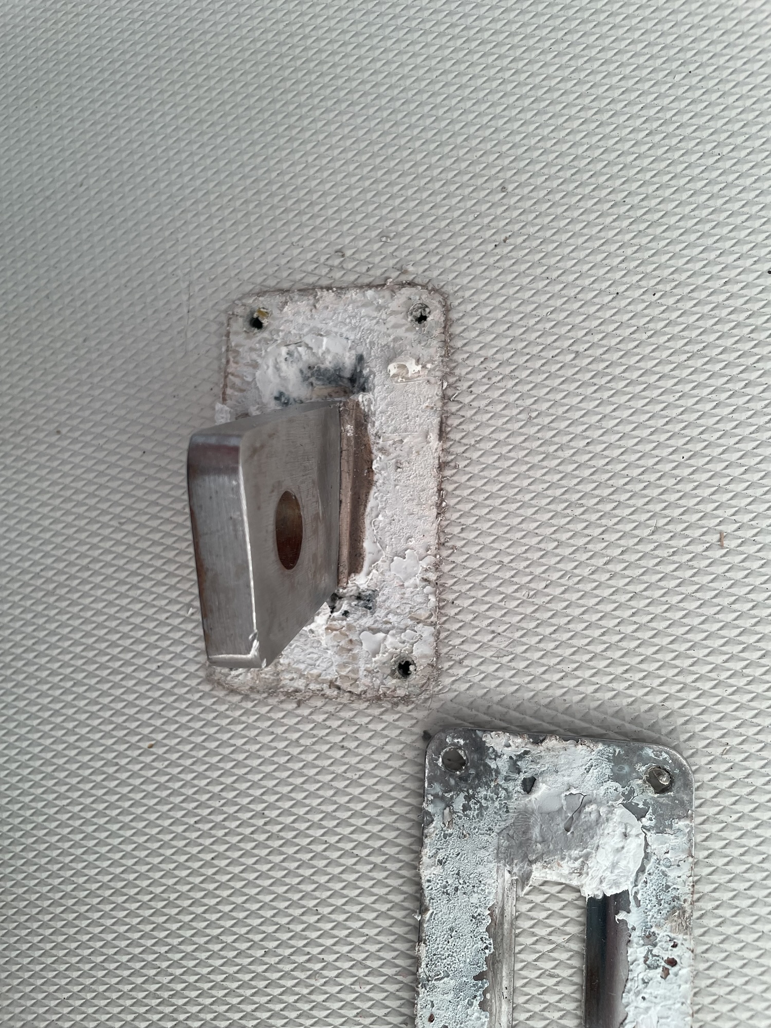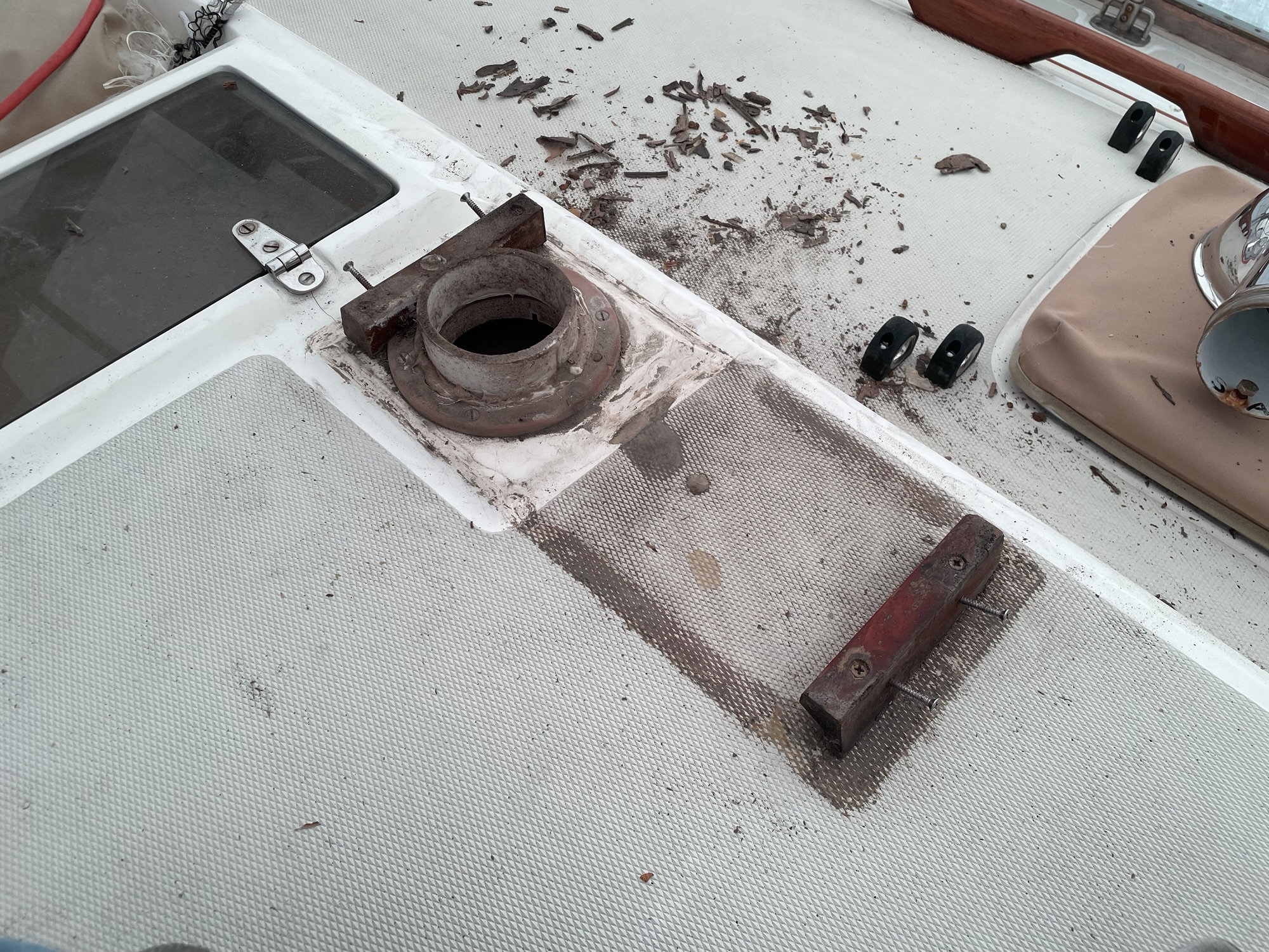 The installers had added these little stand pipes and had fastened them down with 5200. It took a bit of time with a heat gun to get it all off.