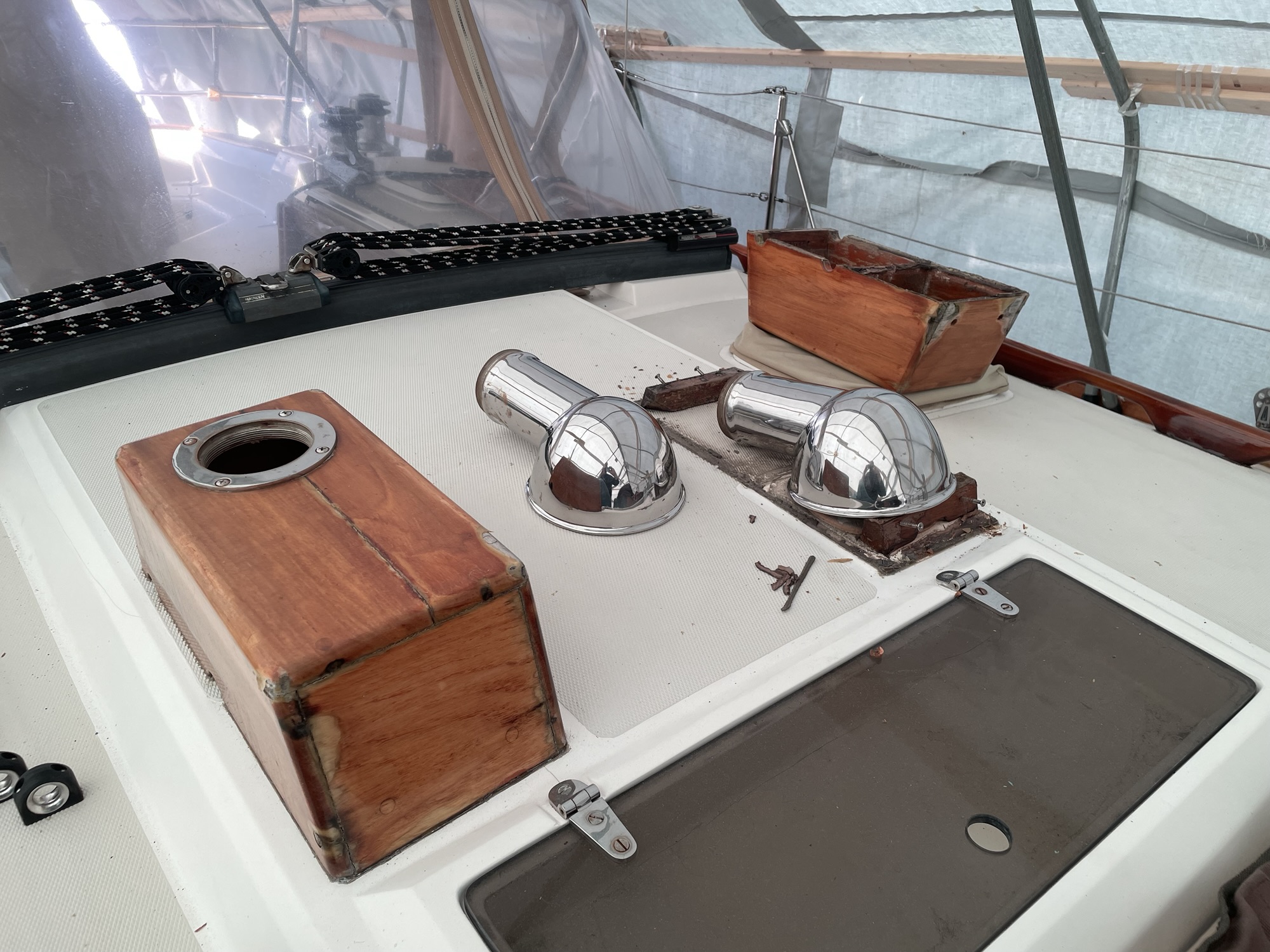 These dorade boxes are off-the-shelf items that did not originally come with the boat. I pulled them off to attempt a refinish in the shop, but they were too far gone. Instead of buying another off-the-shelf set, I am having new ones fabricated that aren’t quite so tall. These never looked right on this boat to my eye.