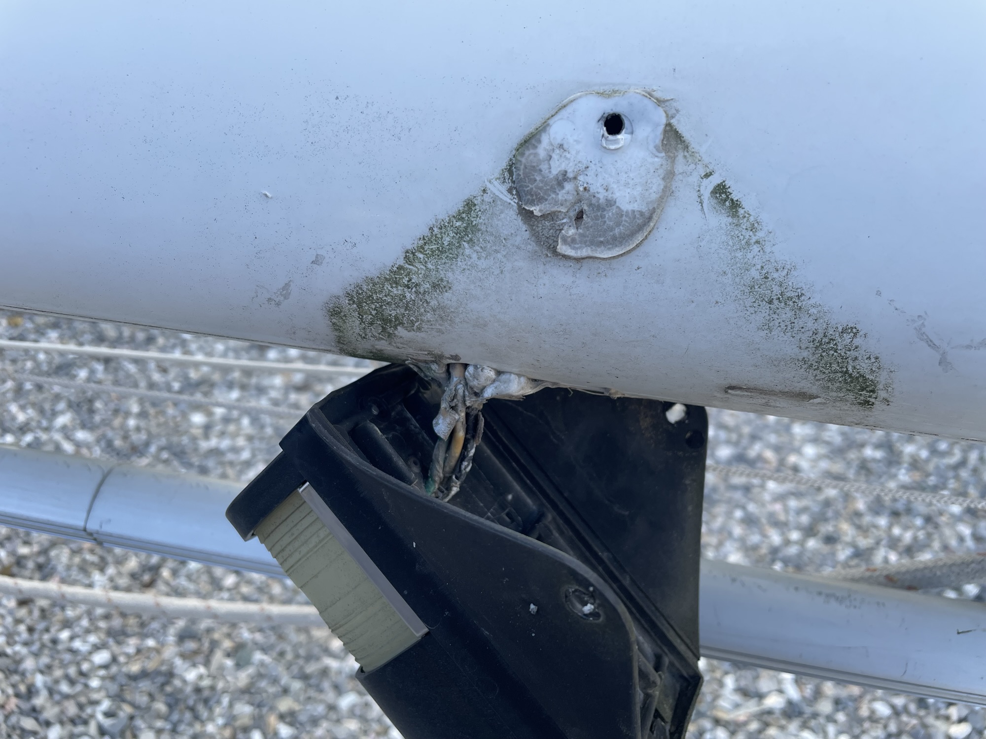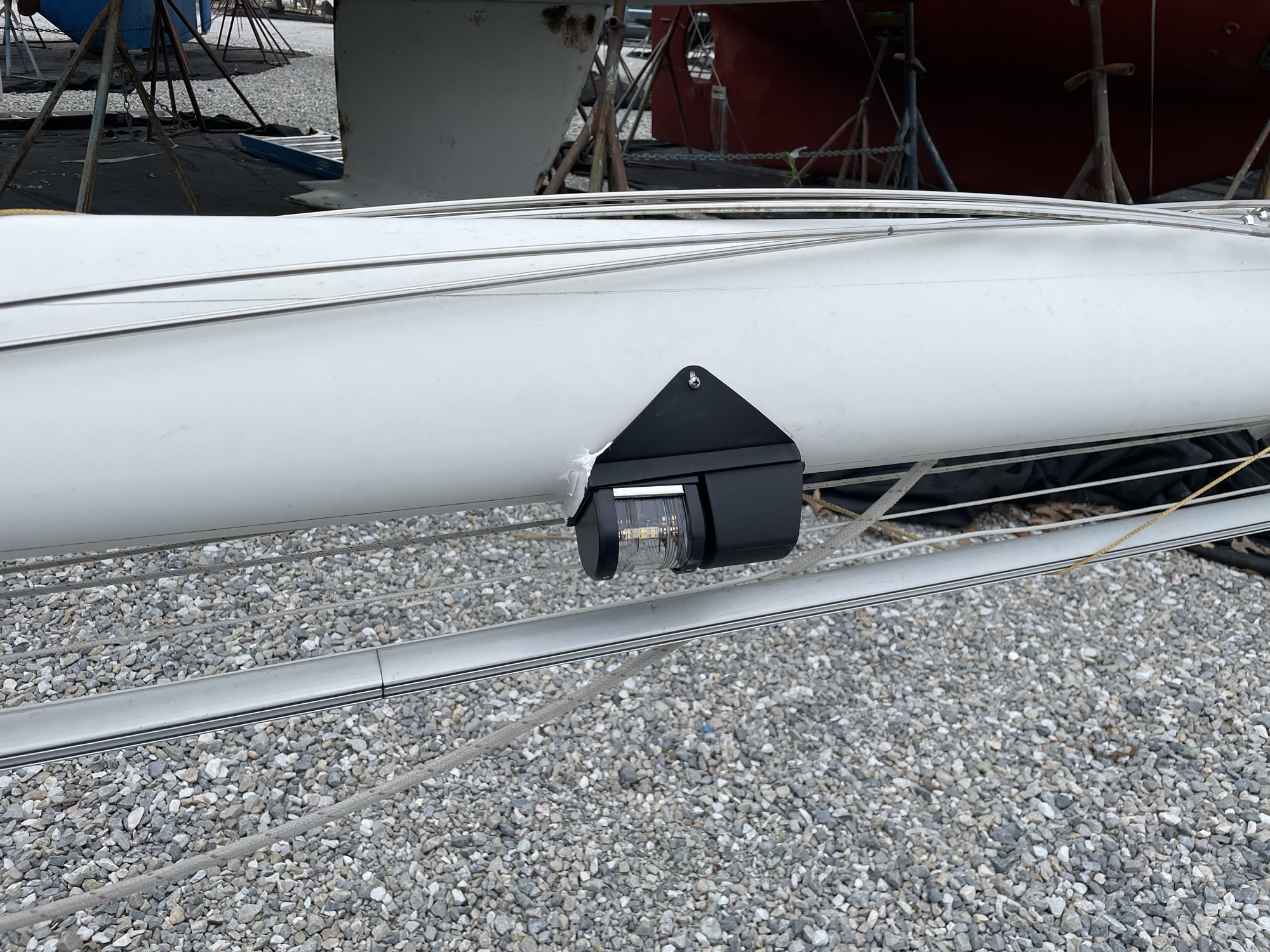 I installed a nice new new LED model. Although the wires are sealed where they enter the unit, I added a bead of sealant along the top edge since 1) no one would ever see it and 2) there was no need to have rainwater passing between the housing and the mast.