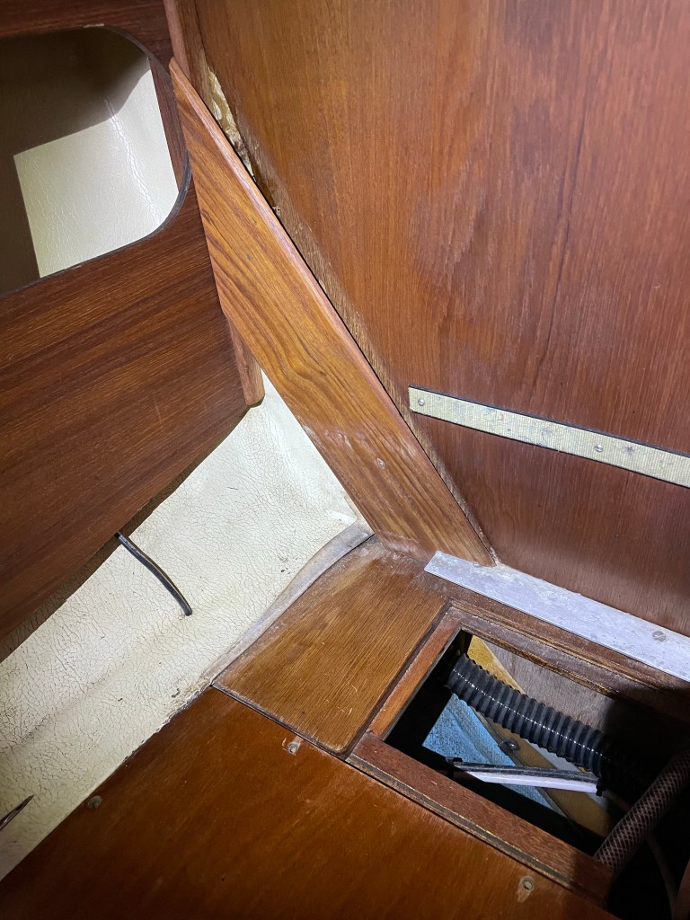 These nice teak panels are used all over the boat to cover bulkhead tabbing. They are nailed in and are usually pretty easy to remove. I I used a permanent marker to note where each came from and how they were oriented. This one needed to come out so that I could remove the large panel behind the settee.