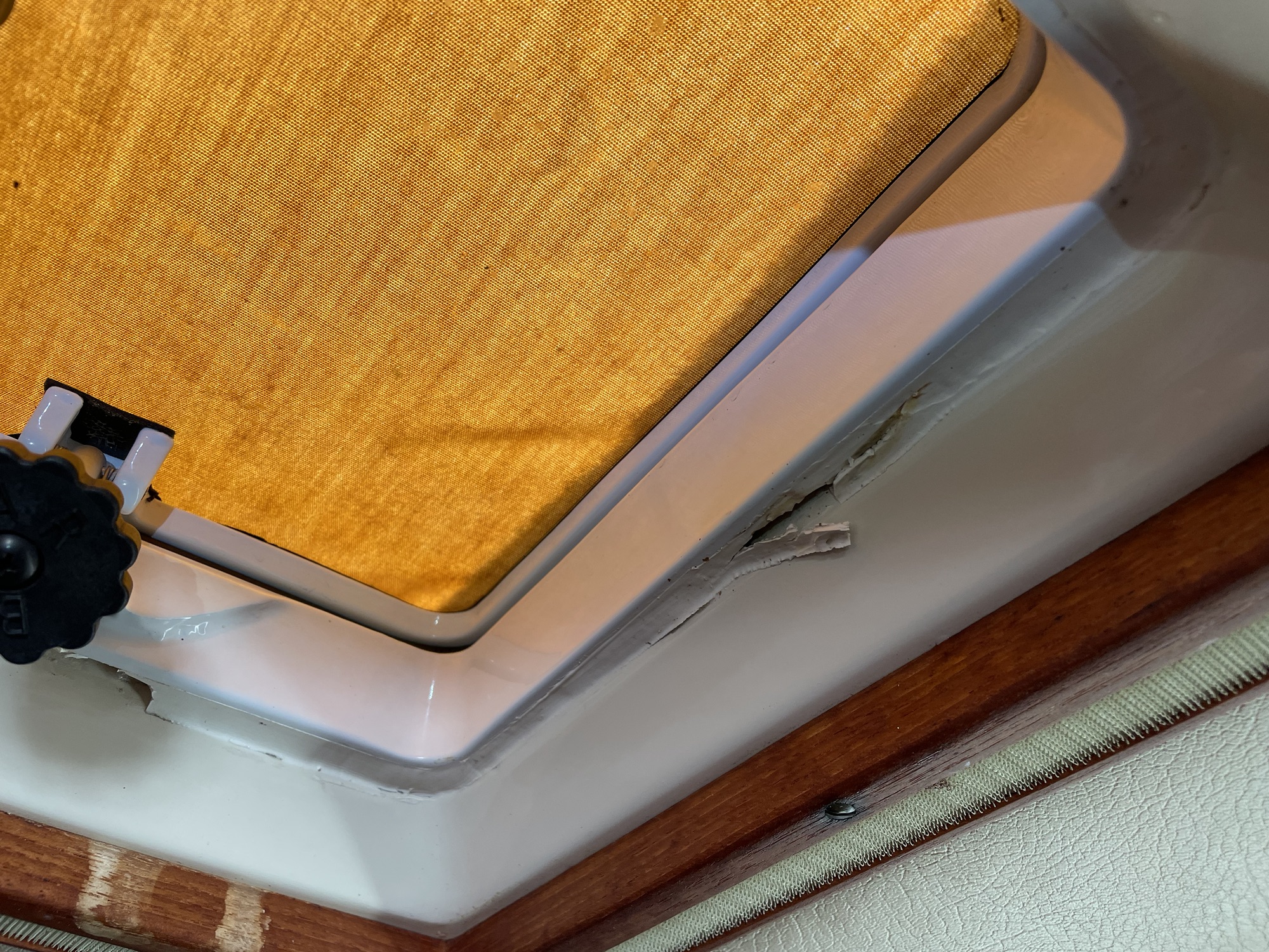 On both of my Sabres, white caulk was used to seal the gap between the underside of the hatch frames and the under-deck headliner. This is entirely for aesthetic purposes, as the last thing one would want to do is to trap water in this space that had already leaked past the seal at the deck. To remove Sabre hatches, begin by breaking the bond between this strip of sealant and the headliner to make the hatch easier to remove. In the photo above you can see the break being made.