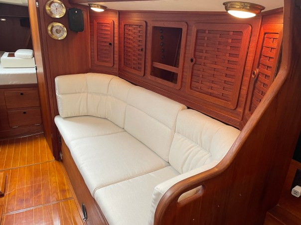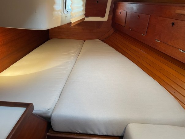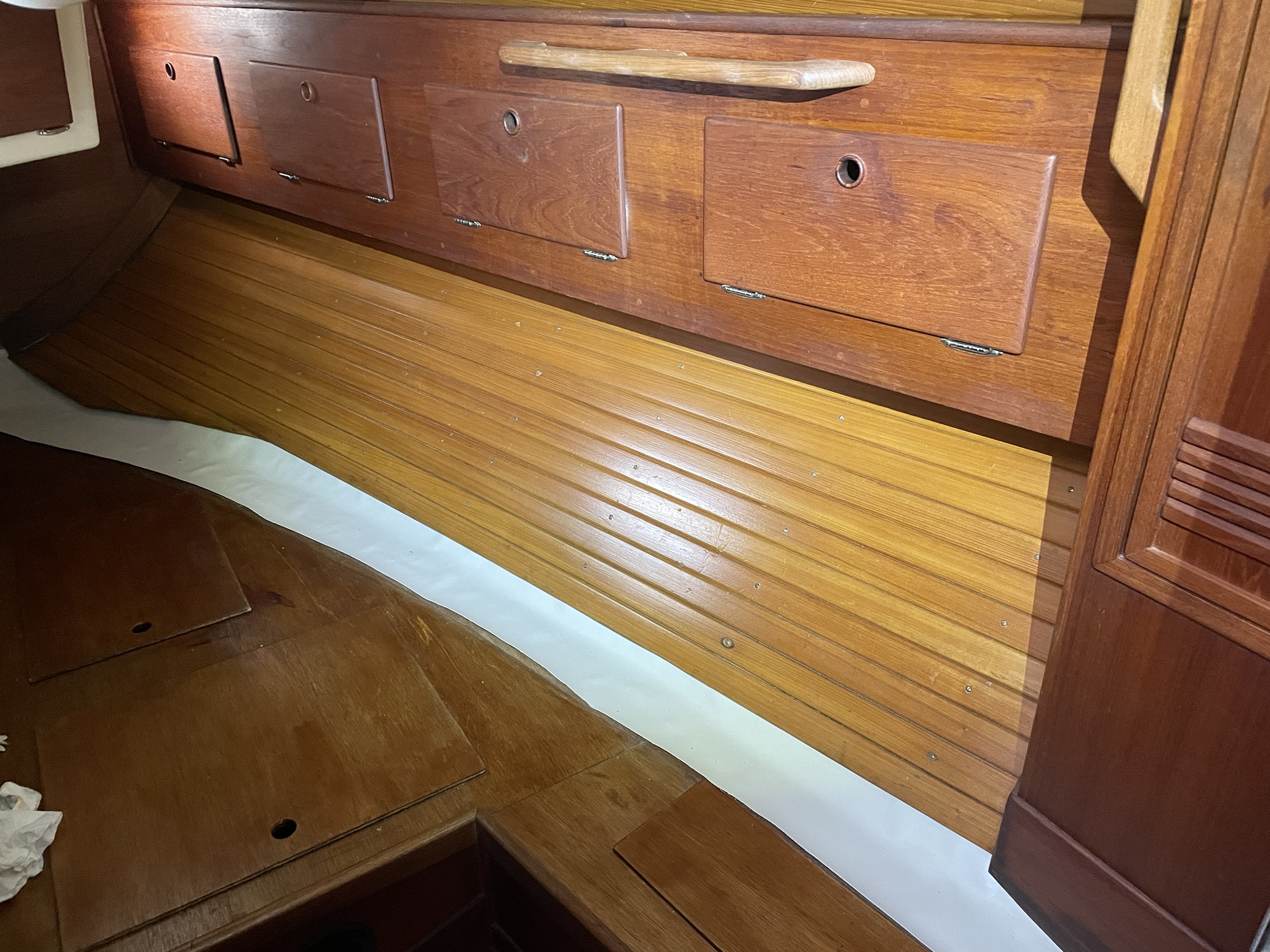 Having owned both our Hylas 54 and two 1980s Sabre now, we have taken note of the extremely high level of fit and finish in the interior of semi-custom boats like the Hylas. Every locker in Rover’s cabin is fully finished with interior panels and shelves, where the lockers in the Sabre are simply lined with vinyl and lack any shelving. The Sabres are incredibly well built in general, but the factory did save on labor in certain contexts like this one. Since I was replacing the vinyl in the port side forward locker anyway, I decided to line it with a floor and side panels and to add a shelf finished with a beautiful walnut veneer we inherited with the Hylas. This post will make it sound like a simple enough endeavor, but it represented a massive amount of work that gave me a whole new appreciation for how many labor hours are in a Hylas!
