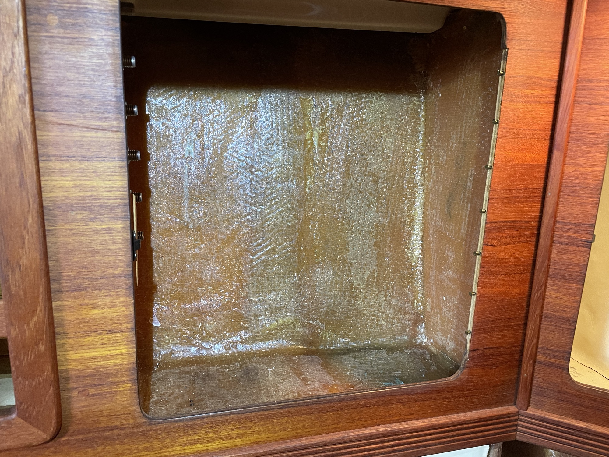 Removing the decorative slatting in the aft cabin last weekend and tearing out the moldy vinyl lining the hull under the cushion allowed me to check today for any leaks remaining in this area of the boat. There was a driving rain this morning and I found a nice little puddle in the berth where the sleeper’s feet would like. Fixing boats is like detective work, and I traced a trail of water to some source above the storage cabinets. Those cabinets are also lined with vinyl, so I started pulling it out and quickly found more mold had gathered under that vinyl over the years. Out it goes!