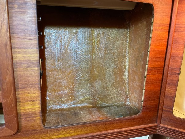 Here is the locker with the vinyl covering removed. Note that Sabre has coated the entirety of the locker with fiberglass to protect the wood bulkheads from rotting way due to the inevitable chainplate leaks that will periodically crop up during the boat’s life. This represents fantastic construction, but simply covering the fiberglass with vinyl felt like a bit of a shortcut – right up until I started this project!