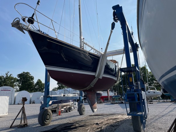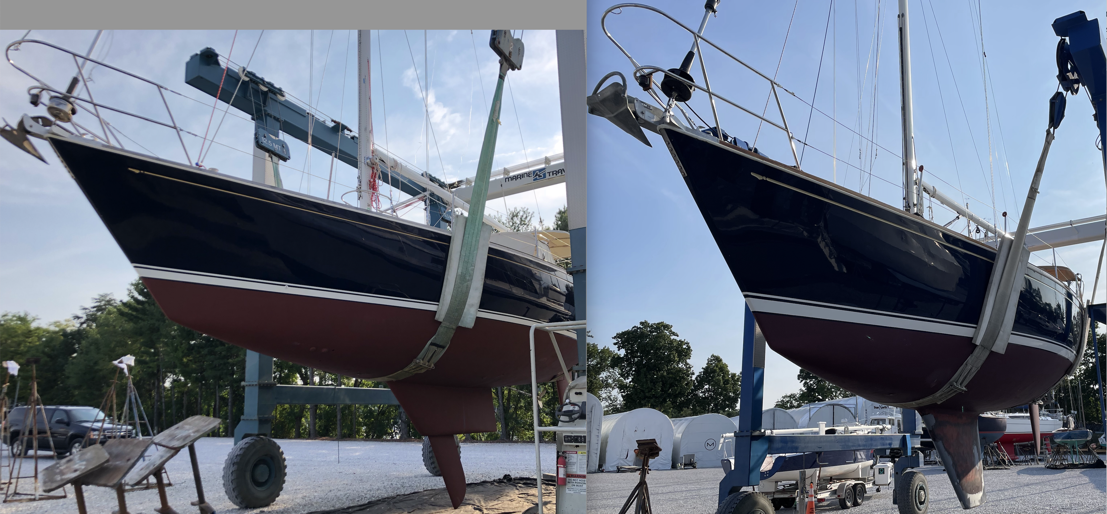 We have launched Blue Moon! But not before we got some minor speed work done! We had some spots on the keel where the fairing compound and lost its bond with the lead, so we had those ground down and re faired. Then we invested in a little bit of speed work indulgence: we hung her in the slings over a weekend and had the bottom of the keel faired!